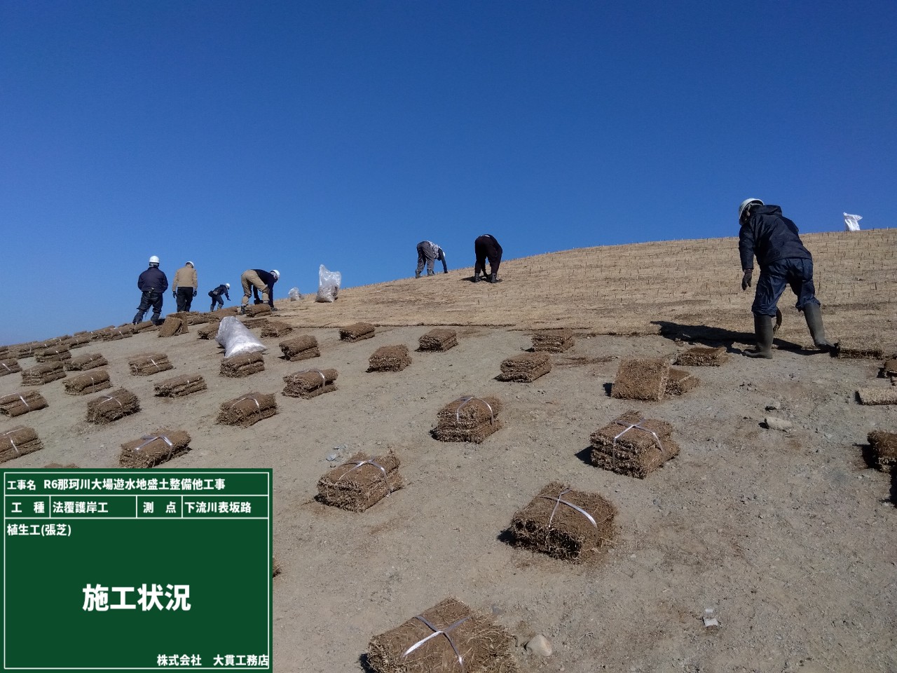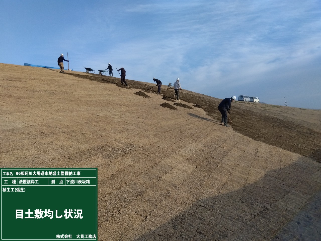 整えた法面に、野芝をベタ張りしていきます。