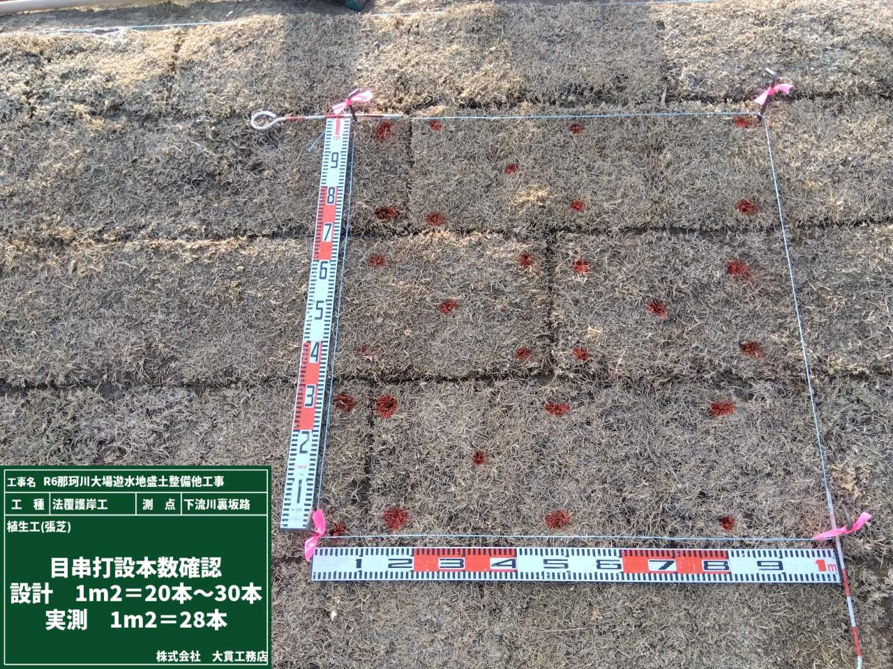 目串の打ち込む本数は現場によって増減しますが、1㎡あたり20~30本という目安があります。