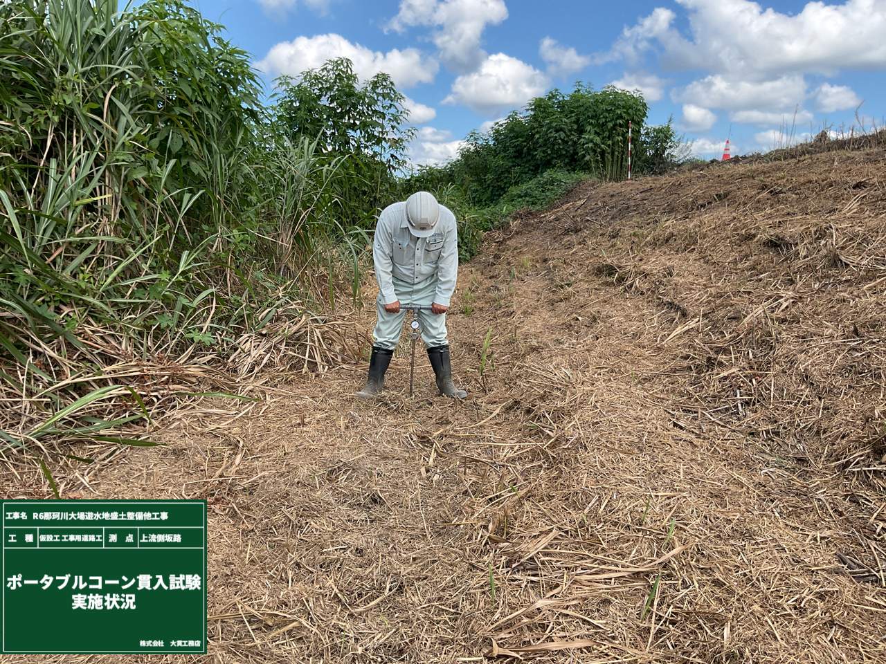 "ポータブルコーン貫入試験"といって、先端が▽の形をしたコーンを、地面に差し込んでいく調査です。