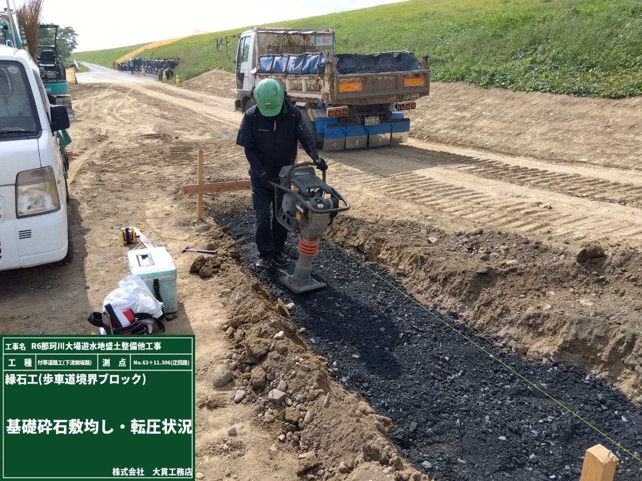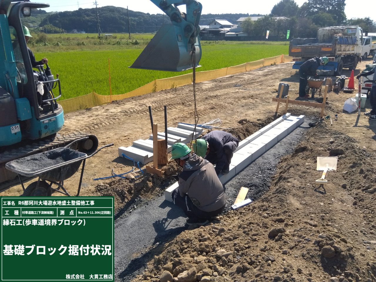 次に基礎砕石を敷均し(7)、転圧で締固め(4)。その後もう一度出来形測定(2)をして精度を確認し、基礎ブロックを据付(3)。