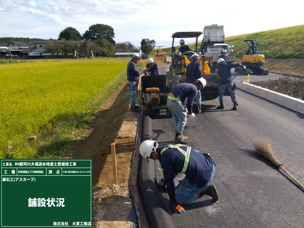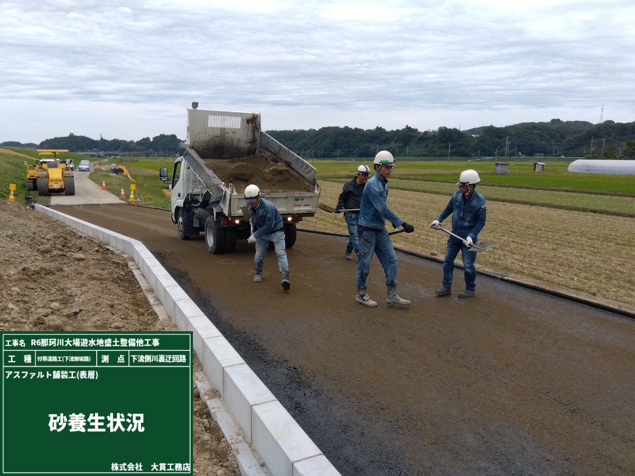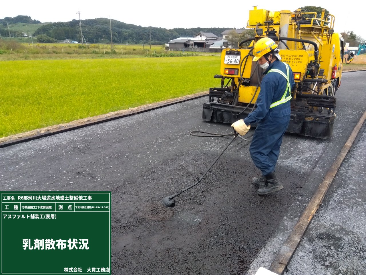 上層路盤の転圧が終わったあとは、路盤の安定と表層との密着を高めるために乳剤散布・砂養生を行いました。