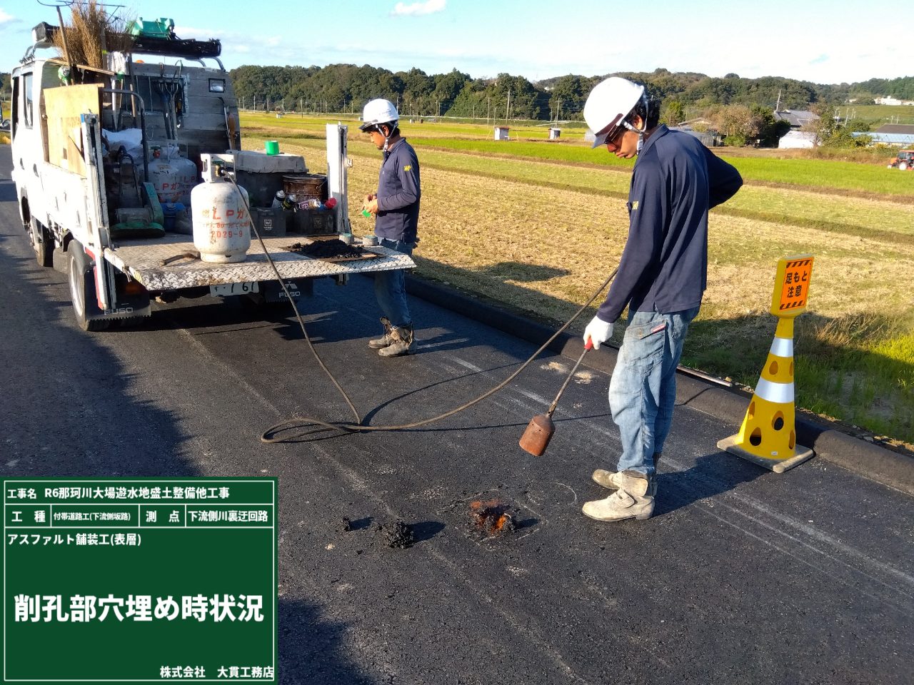 バーナーであぶり、アスファルトを詰め、コテで平らに仕上げると──
