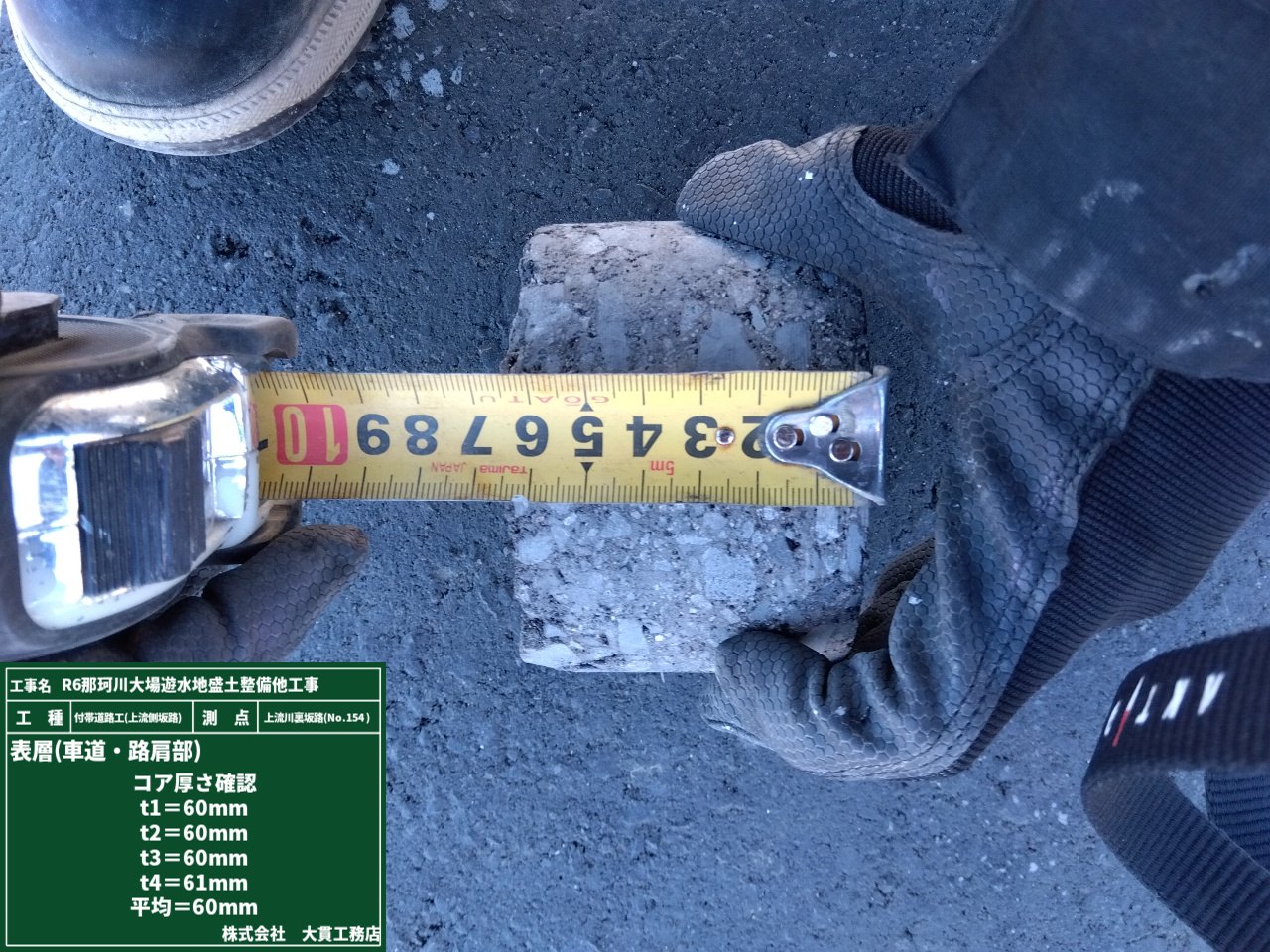 採取したコアを使って、出来形確認を行いました。